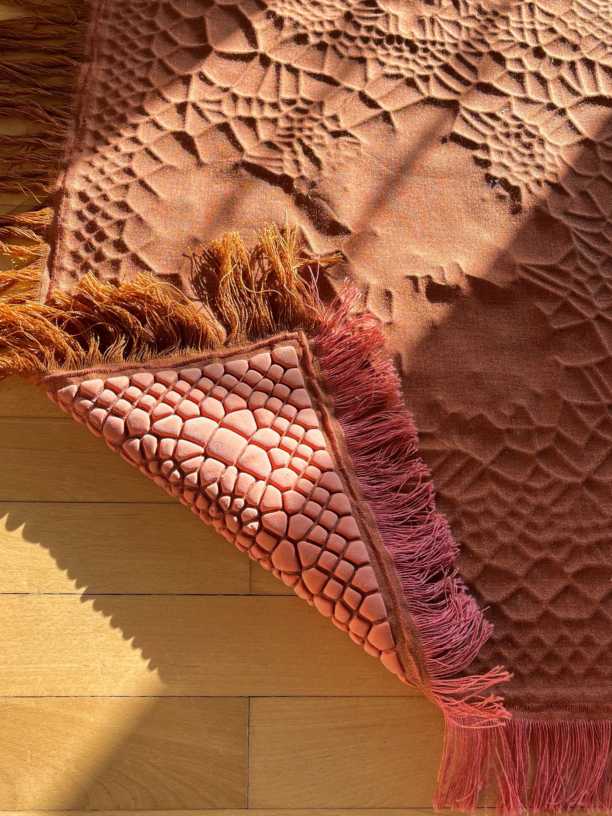 The baked ornament rug is an interpretation of a traditional hand-woven carpet. Instead of weaving, the digitally produced pattern is printed directly on to the fabric with the textil technology GRDXKN. The printed textil colour expands through heat and is reproducing the printed pattern as a three dimensional relief on the other side of the fabric. It is stabalizing the textile, is giving it a body, a shape and thus prevents it from slipping on the floor.