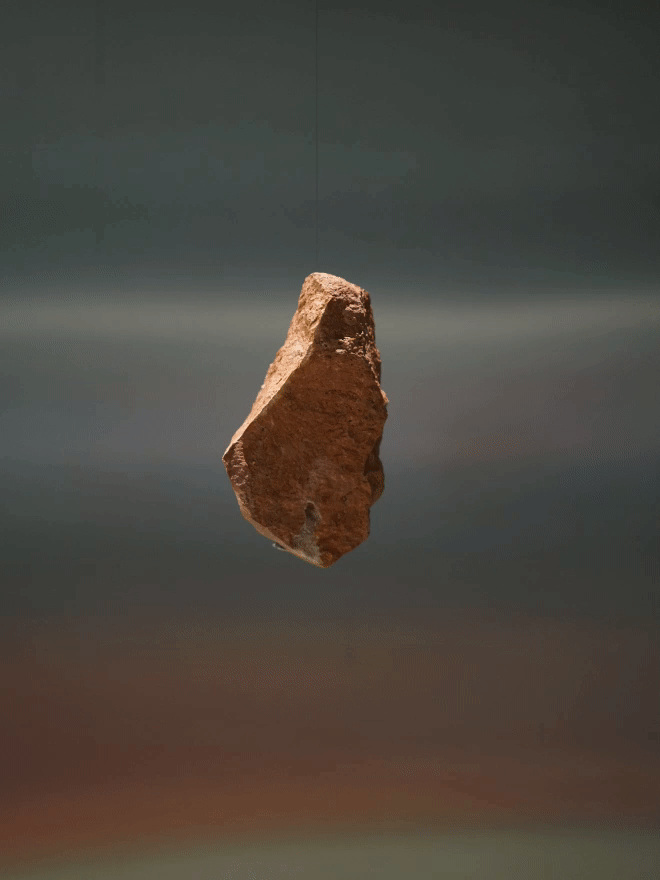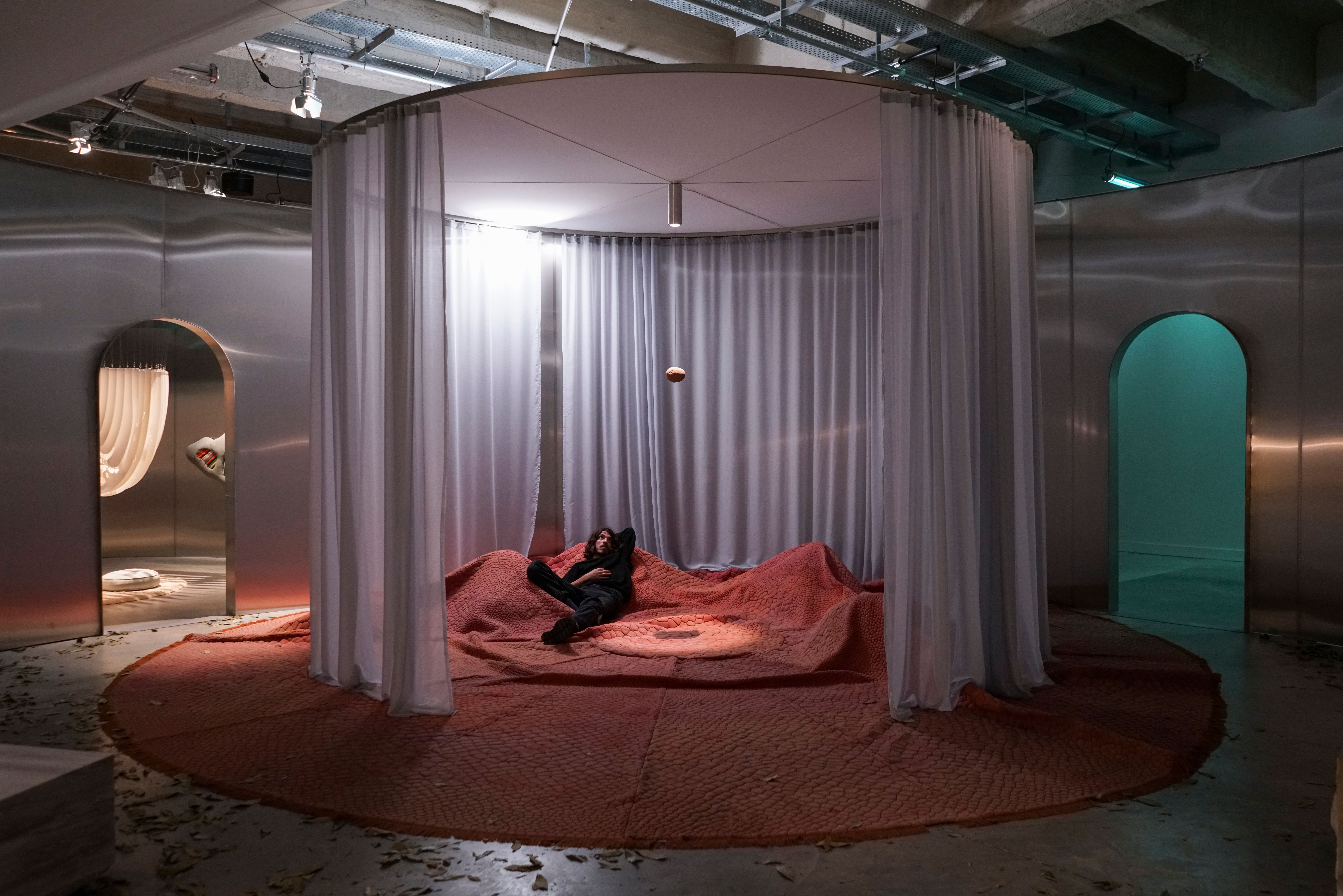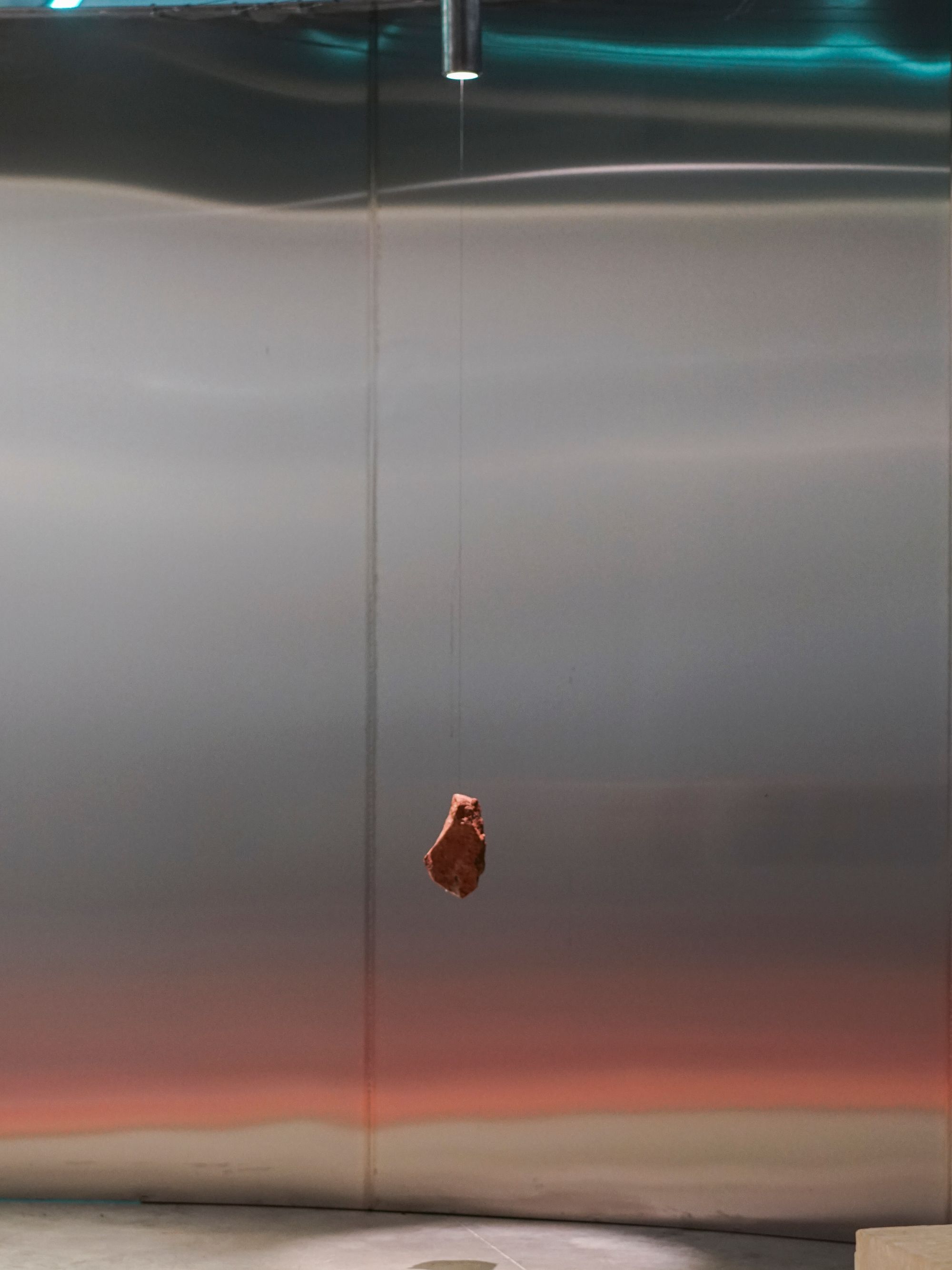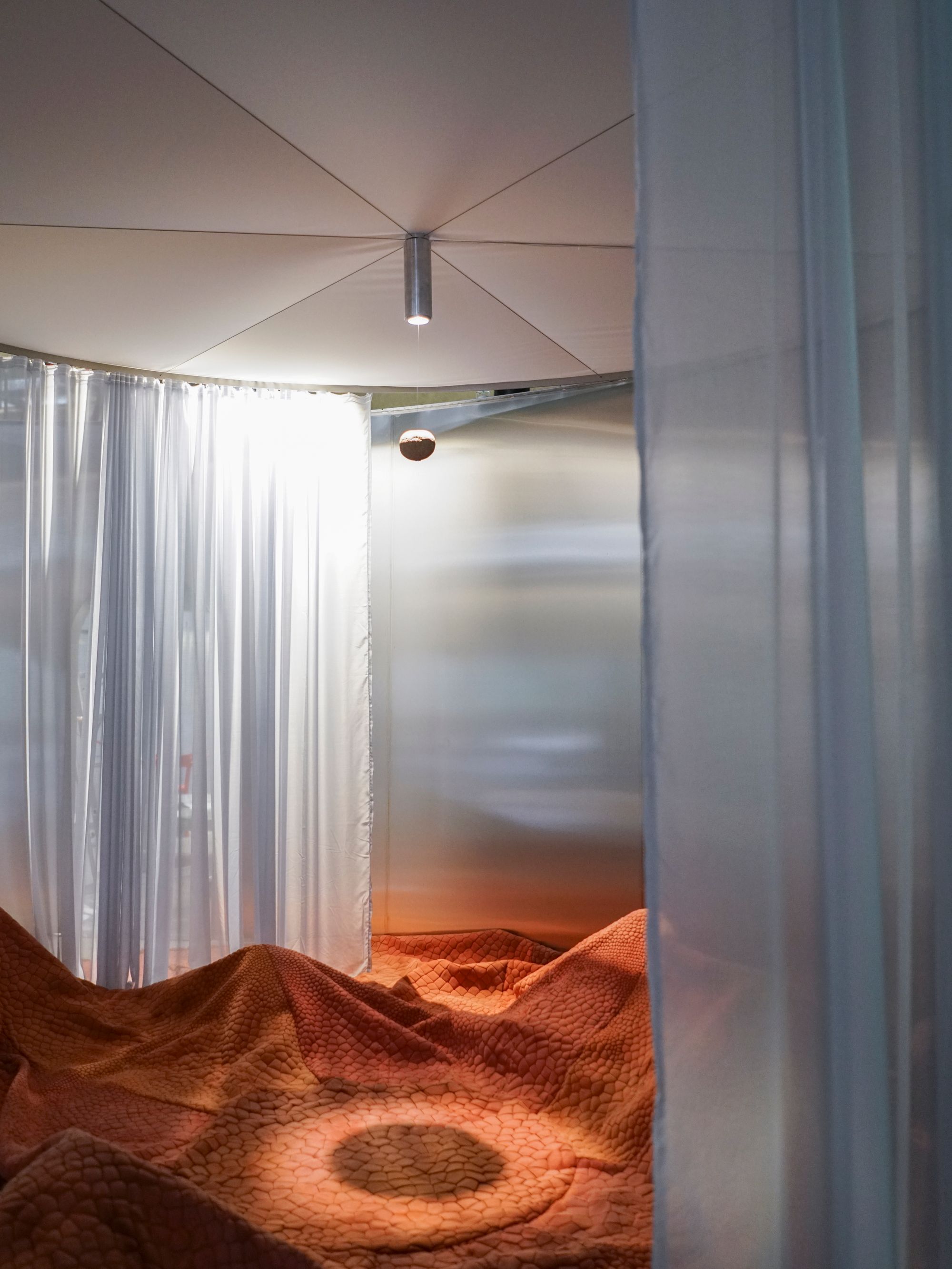 The exhibition Places to be at the Fondation Martell in Cognac, brings together 14 international designers and artists around a common project: the joint reconstruction of a unique living space composed of 11 rooms, each designed by an artist or group of artists. For the space assigned to us, the living room, with a diameter of about 9 meters, we developed our own aesthetic universe with objects that visitors can interact with. In the fictional living room called Das Stumme spricht, the primary functions of a living room were maintained, but also the boundary between man and nature was kept as small as possible to convey the feeling of being grounded and involved, in a natural play between phenomena. All objects encounter the visitor with a movement or a certain gesture that can be interpreted. From the rhythm of the spinning lamp, the ambiguity of the shapes and movements in the objects themselves, to the dried leaves on the floor, everything in this space is marked by constant change and represents life itself.