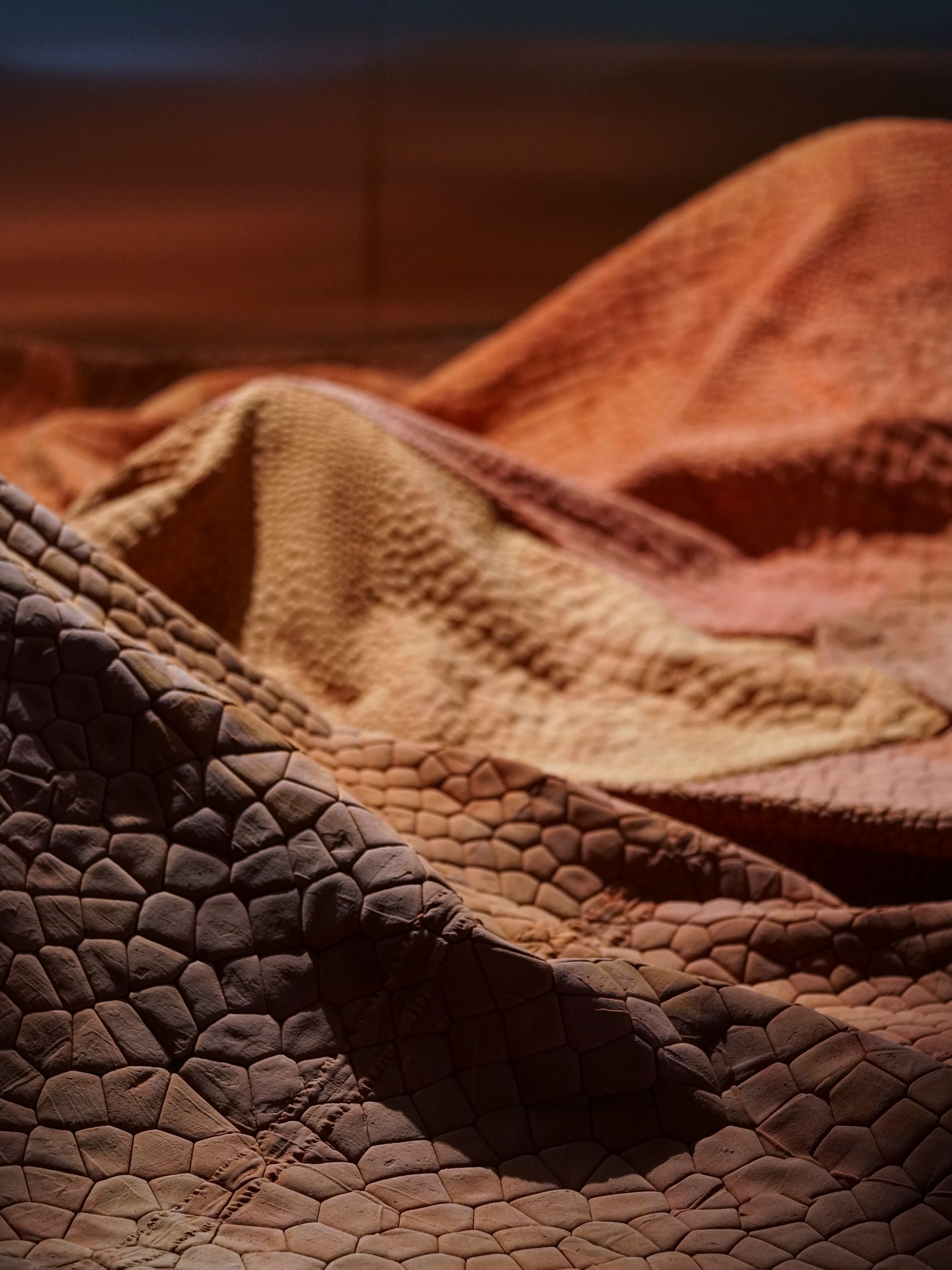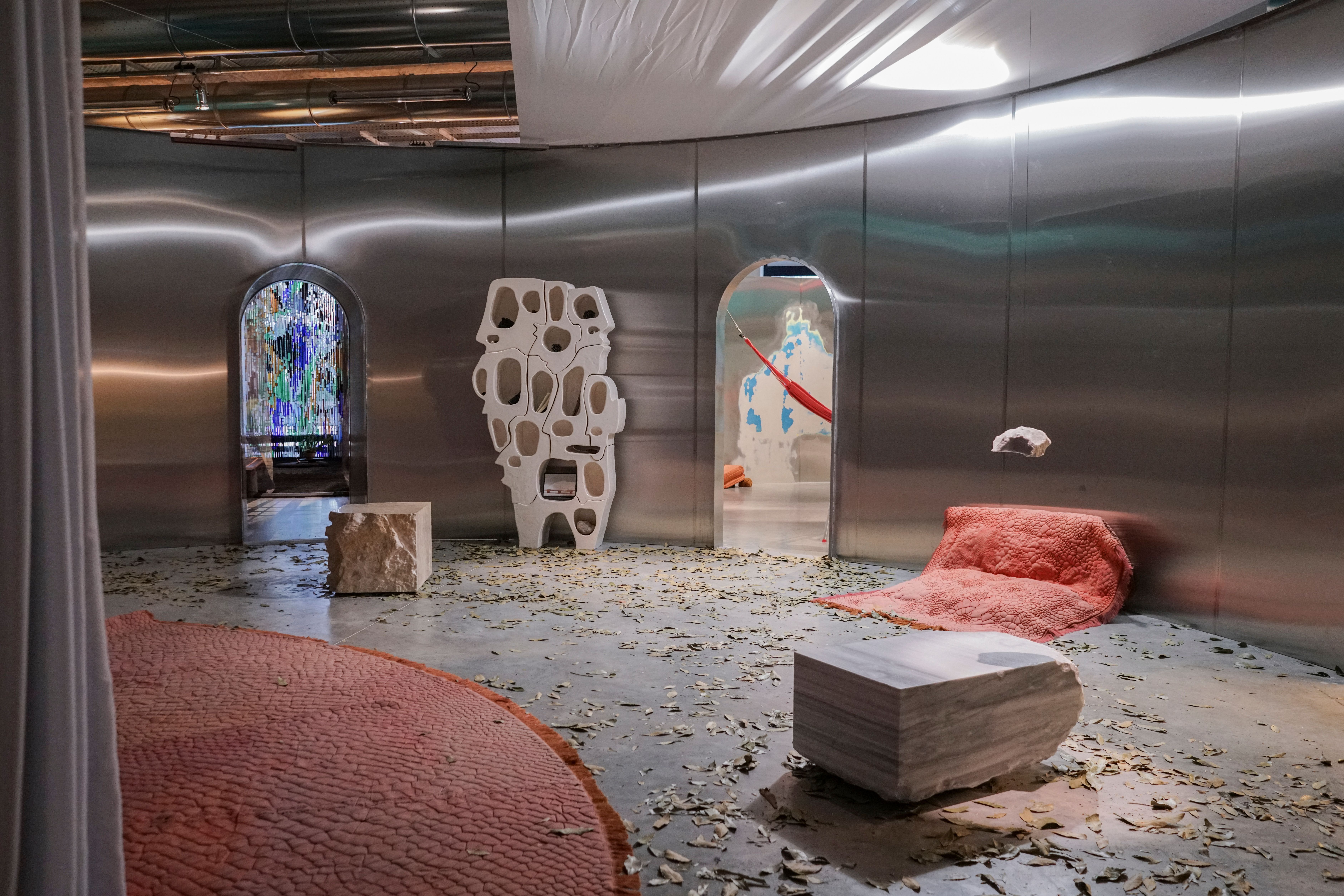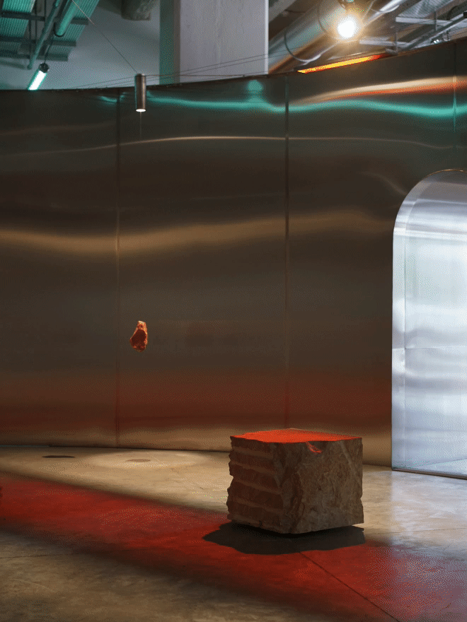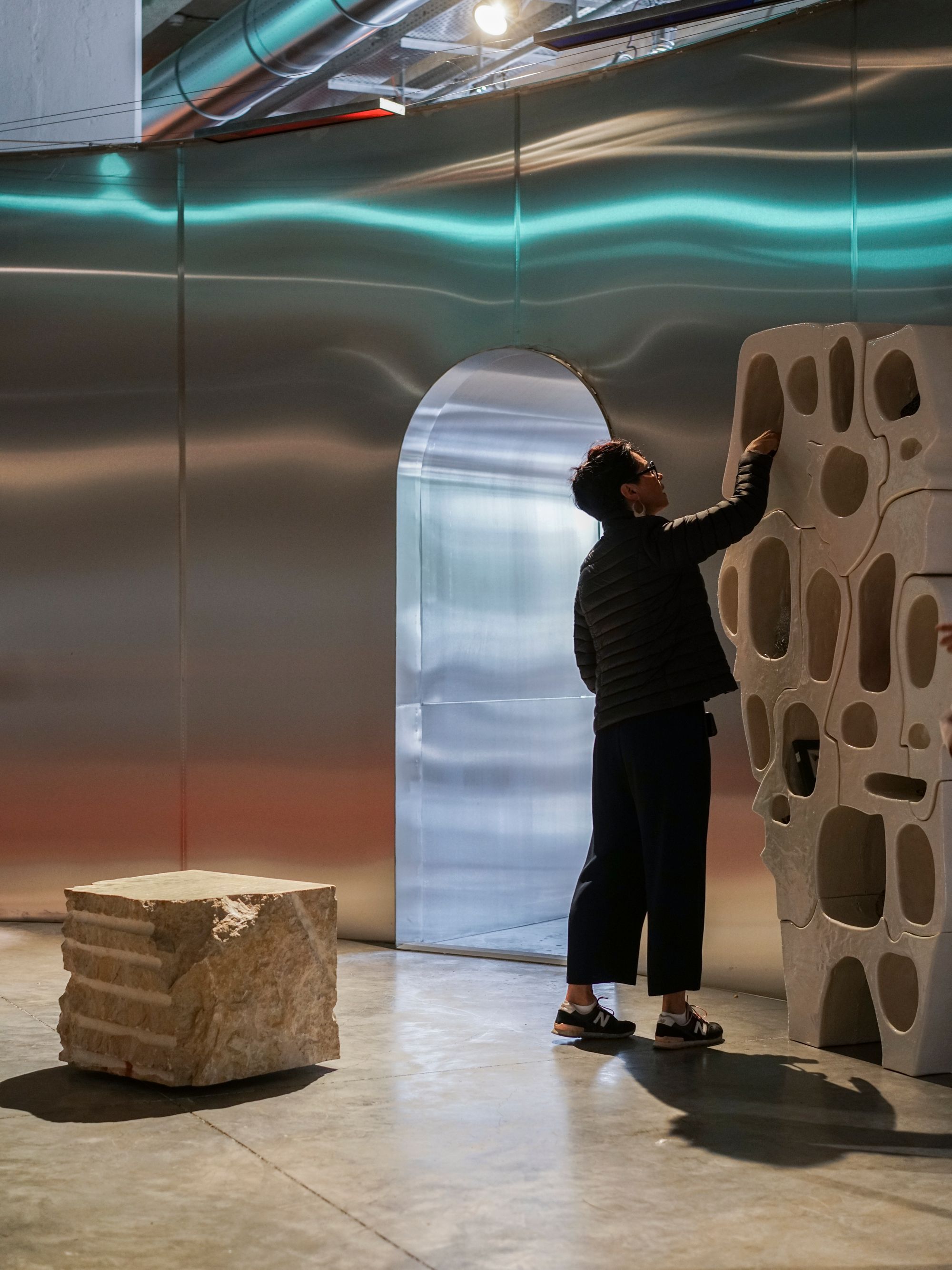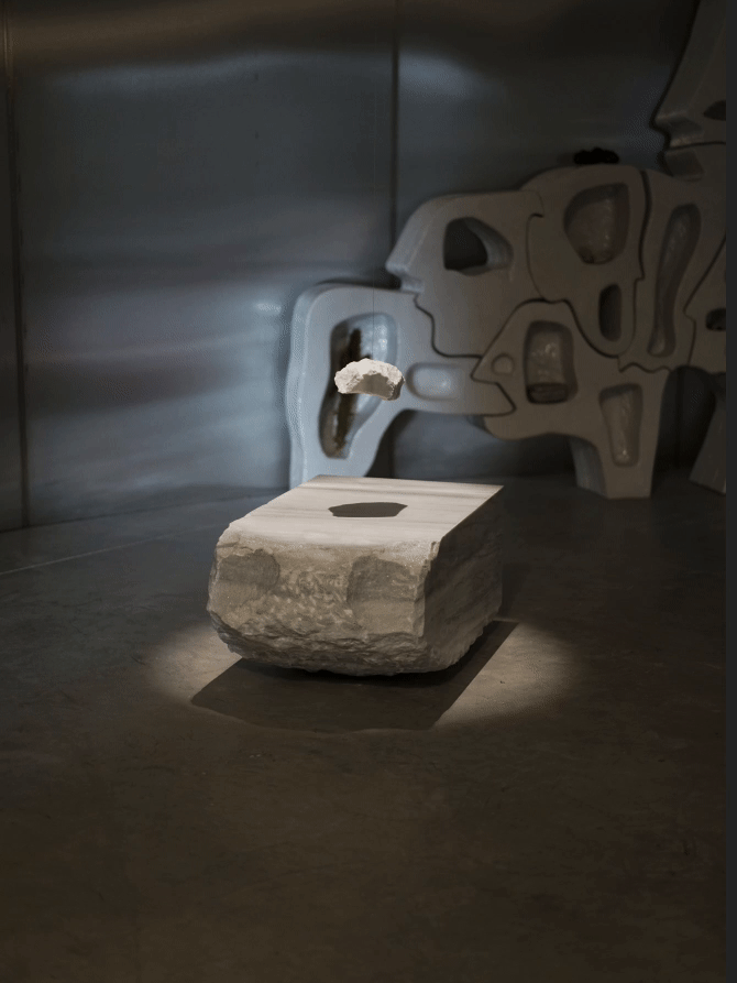 The exhibition Places to be at the Fondation Martell in Cognac, brings together 14 international designers and artists around a common project: the joint reconstruction of a unique living space composed of 11 rooms, each designed by an artist or group of artists. For the space assigned to us, the living room, with a diameter of about 9 meters, we developed our own aesthetic universe with objects that visitors can interact with. In the fictional living room called Das Stumme spricht, the primary functions of a living room were maintained, but also the boundary between man and nature was kept as small as possible to convey the feeling of being grounded and involved, in a natural play between phenomena. All objects encounter the visitor with a movement or a certain gesture that can be interpreted. From the rhythm of the spinning lamp, the ambiguity of the shapes and movements in the objects themselves, to the dried leaves on the floor, everything in this space is marked by constant change and represents life itself.