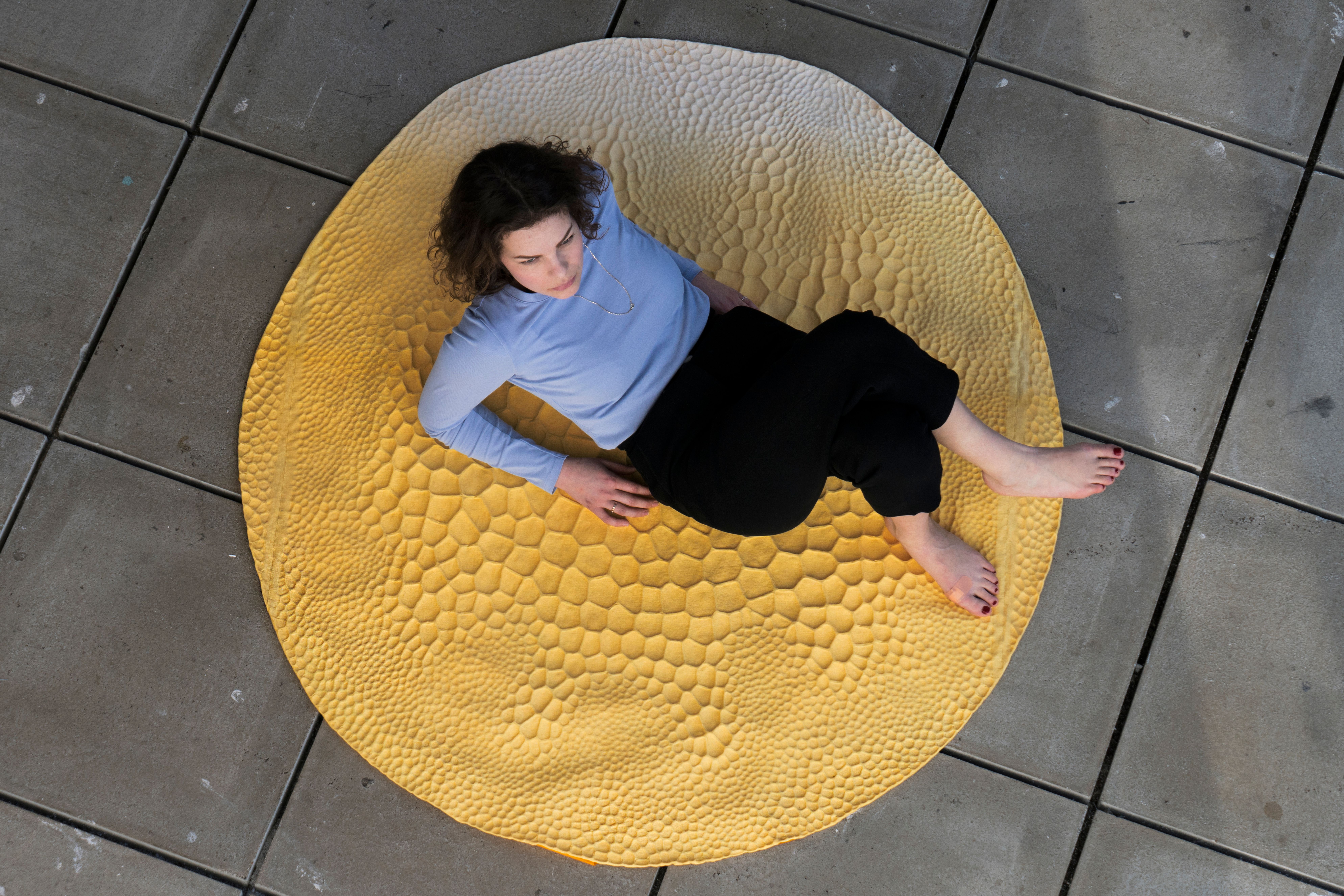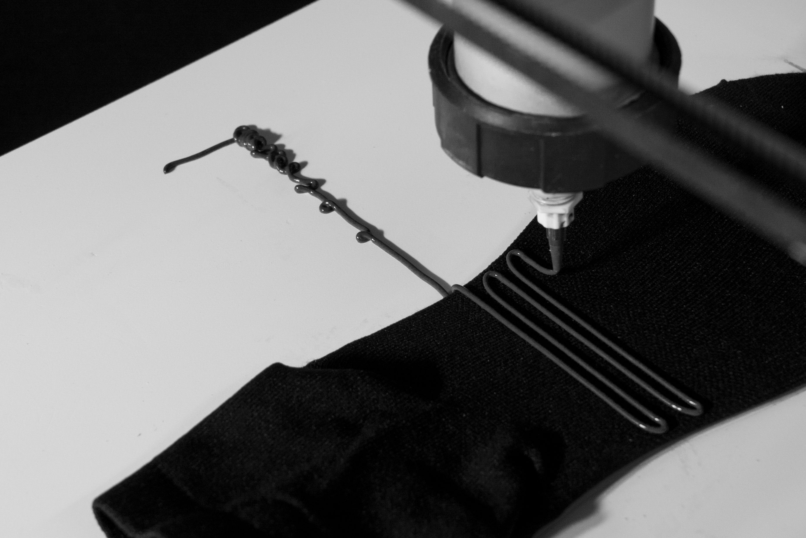 In this project we research on further application potentials of the structure printing technology GRDXKN and technical possibilities of implementation. The printing technology gives the textil through its colour a body, a shape and thus brings with it new properties such as abrasion resistance, slip resistance, water repellency, upholstery and textile stabilisation. In addition, the printed pattern is plastically reproduced on the reverse side of the fabric.The ink is applied to the textile using a stencil printing process. Through temprature the ink bonds firmly with the textile and gains volume. Our material research results in three new application potentials: a jacket with soft protection, a 3D printed sole for a sock shoe and a carpet. The jacket is an everyday protective jacket for cyclists in the city. The different density of the pattern adapts to the individual body shape and makes a comfortable movement possible. A special focus of this project is the use of rapid prototyping technologies in combination with GRDXKN. Numerous tests, test arrangements and prototypes have been developed for this purpose. The 3D printer serves as a threedimensional drawing tool. The sole is printed directly on the sock, which is stretched over a last.