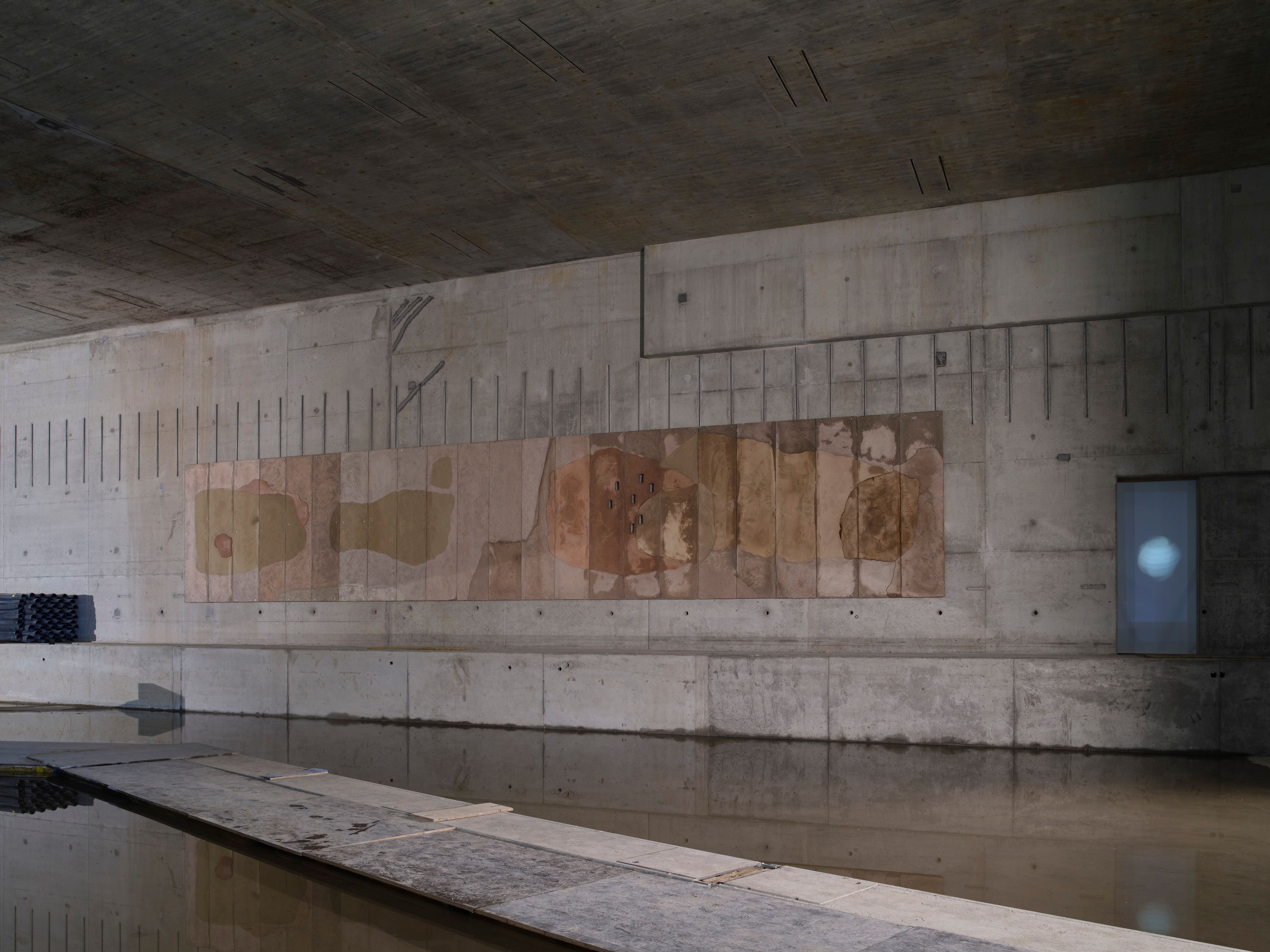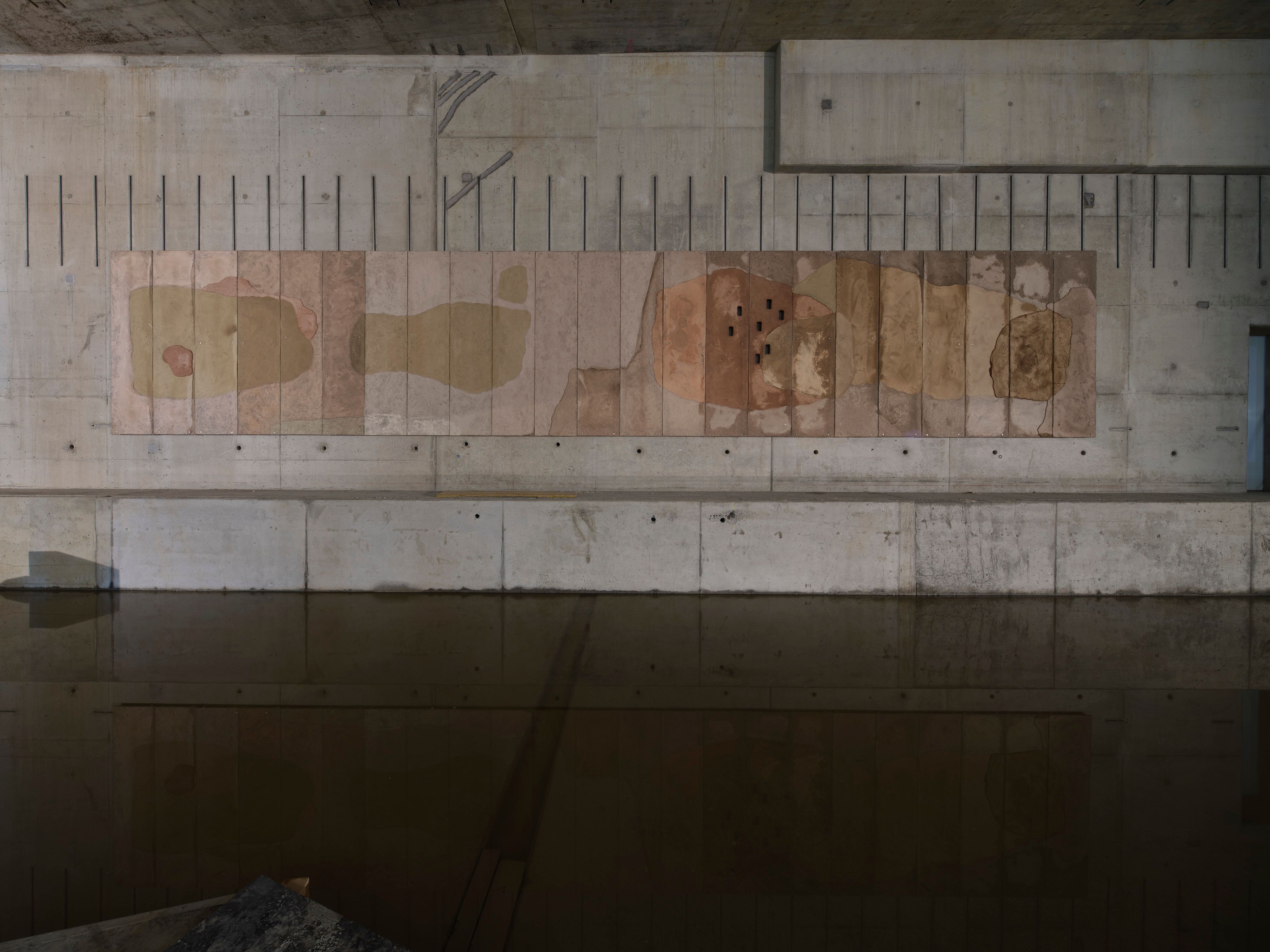 In the sequence of collecting, documenting, digitizing, archiving and recycling, we wanted to give new value to excavated earth from the construction site for the exhibition. During this process, the earth was transformed into geopolymers, a material that is being researched as a sustainable alternative to concrete, and applied as plaster on a base material. In the form of a 13.8 m long wall relief, this material experiment presents itself as a contrasting painting in the middle of a concrete landscape and emphasizes the aesthetic qualities and design potential of this building material.